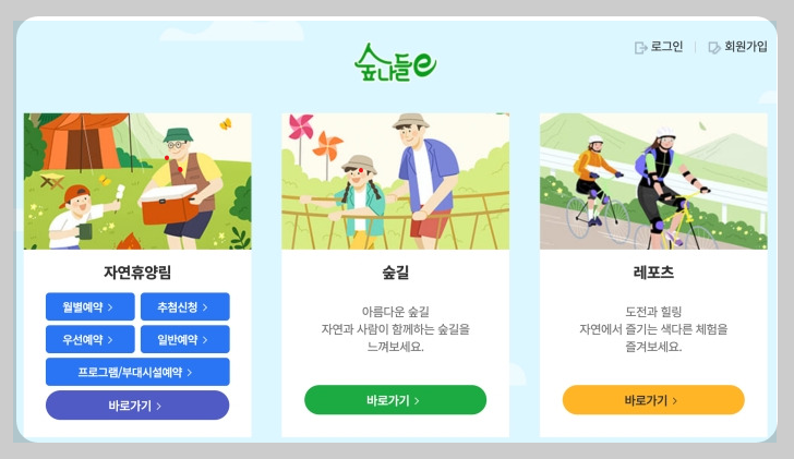 먼저 숲나들e 홈페이지를 검색하시거나 아래 링크를 통해서 홈페이지에 들어갑니다. 아래 버튼을 누르시면 예약사이트로