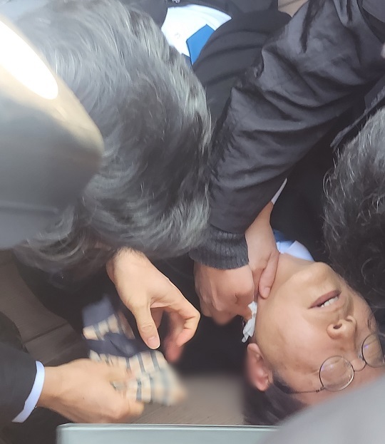 그대로 바닥에 쓰러진 이재명 대표는 셔츠가 젖을 정도로 피를 흘렸고, 괴한은 그 자리에서 경찰에 체포되었습니다.