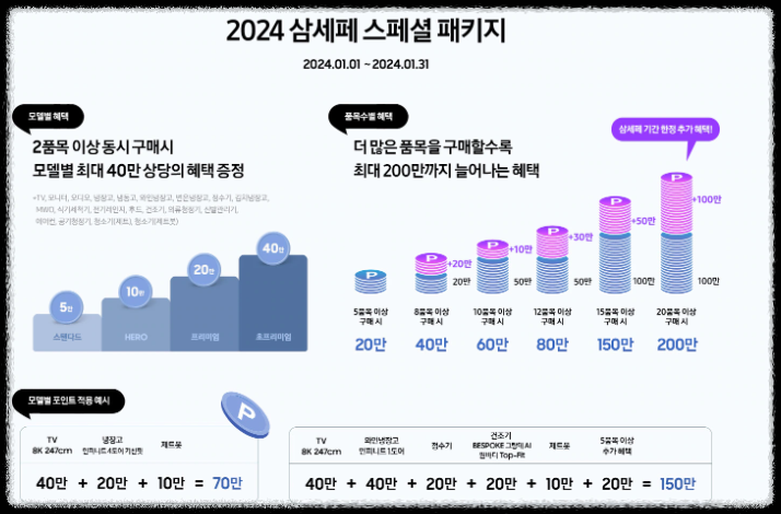 삼성전자는 최대 680만 원 상당의 삼성전자 멤버십 포인트 및 캐시백의 혜택으로 '스페셜 패키지'로 확대 운영 중에 있습니다. 2 품목 이상 구입 시 품목에 따라 최대 40만 원 상당의 혜택이 주어집니다.